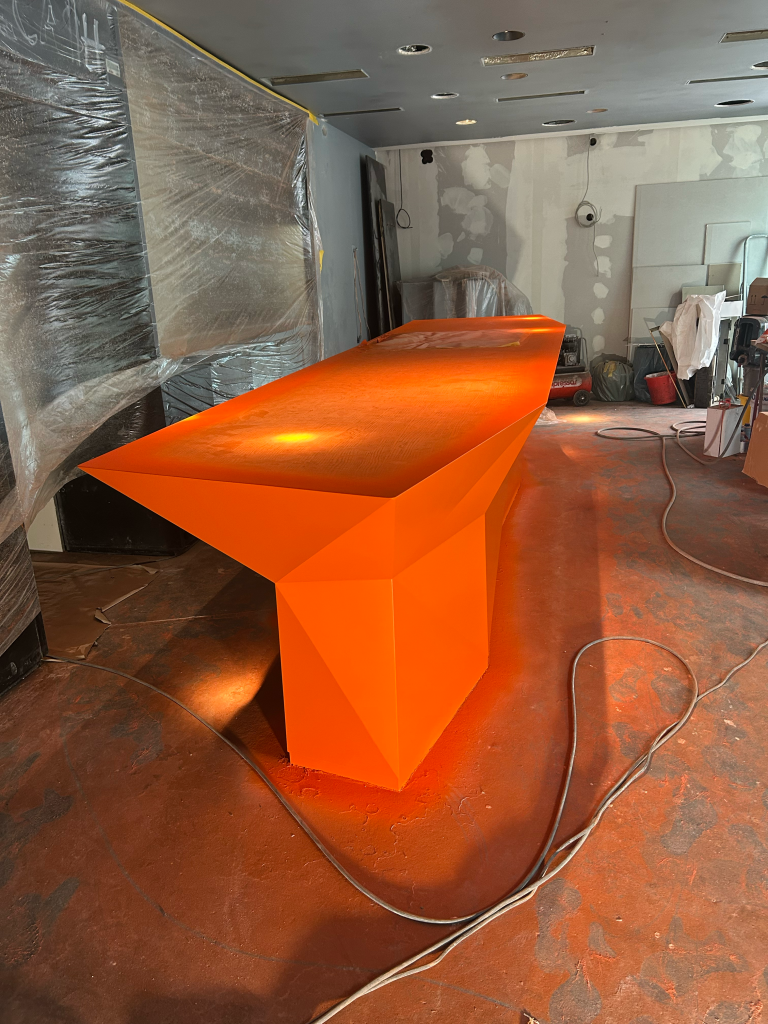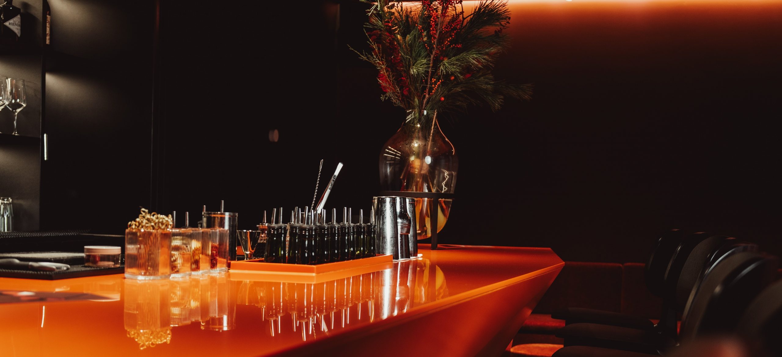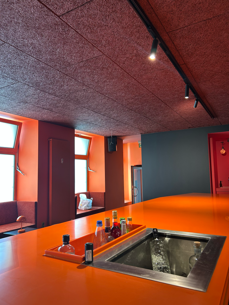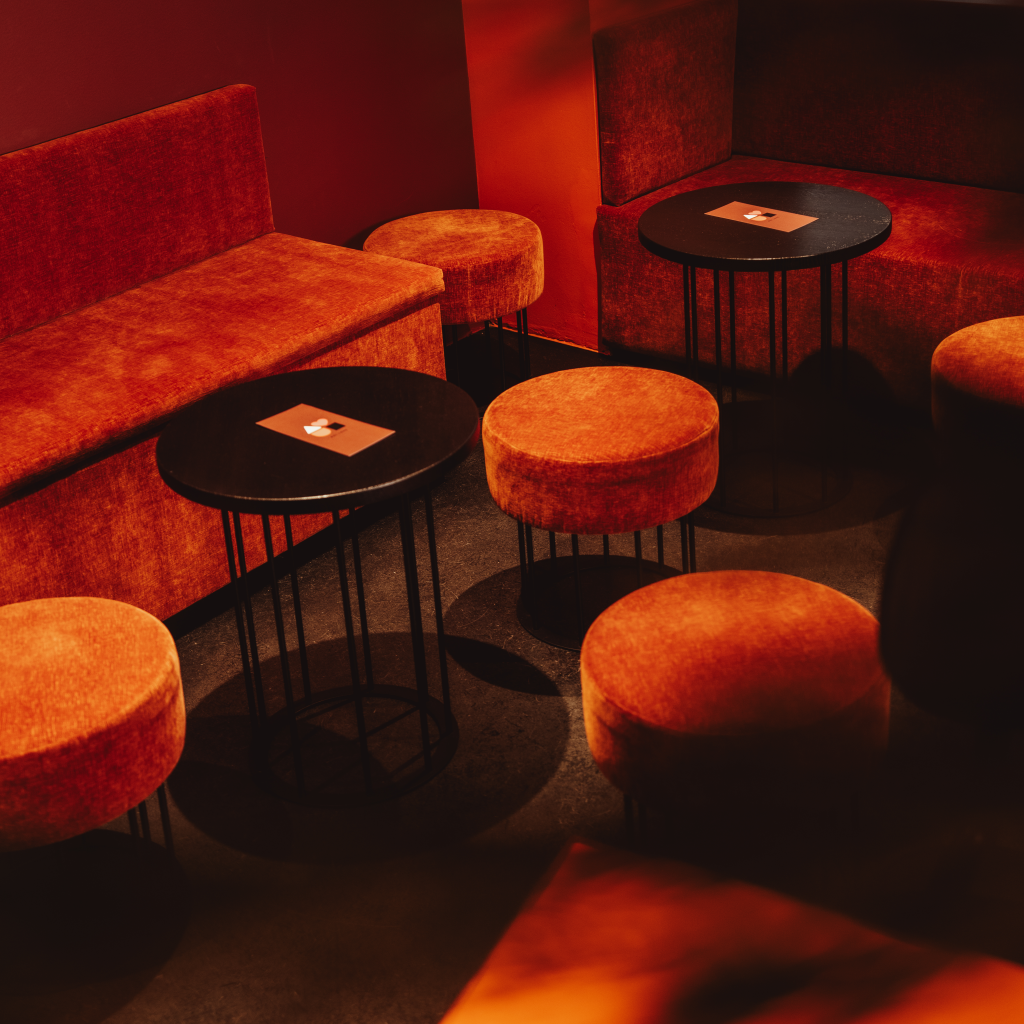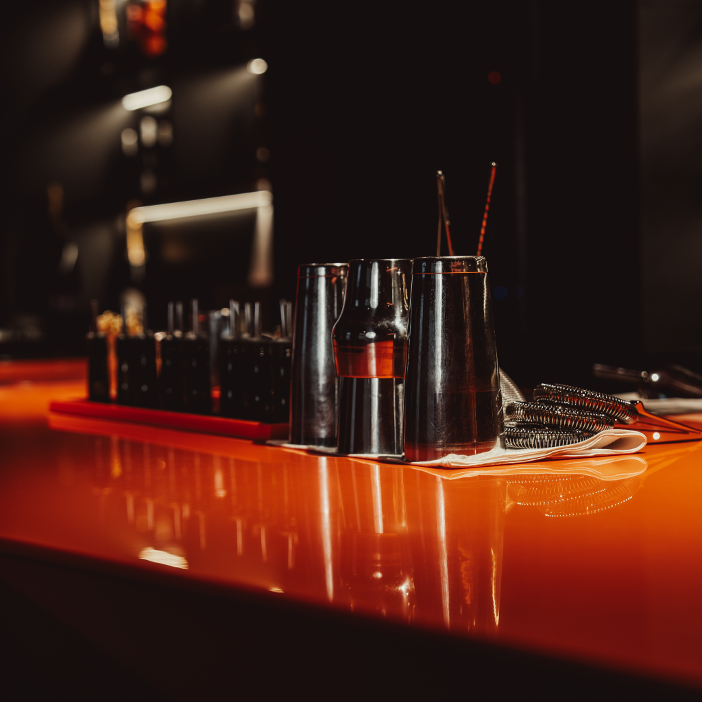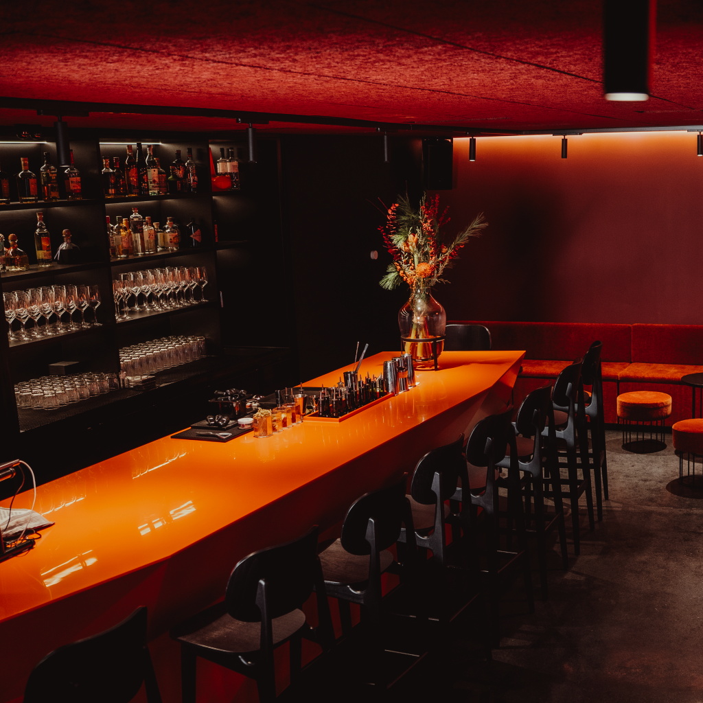 At the heart of the bar is a large, custom-designed orange counter. It acts as a central meeting point — connecting guests, bartenders, and the DJ, and creating a natural flow within the space.